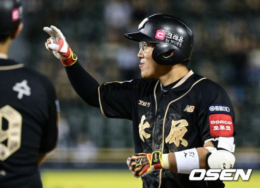 [OSEN=잠실, 조은정 기자]11일 오후 서울 잠실구장에서 ‘2025 신한 SOL Bank KBO리그’ LG 트윈스와 KT 위즈의 경기가 열렸다. 홈팀 LG는 치리노스, 방문팀 KT는 헤이수스를 선발로 내세웠다. 7회초 2사 1,2루 KT 허경민이 동점타를 날린 뒤 세리머니를 하고 있다. 2025.09.11 /cej@osen.co.kr