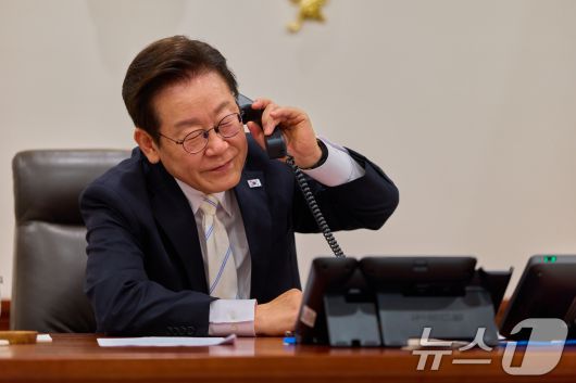 (서울=뉴스1) 허경 기자 = 이재명 대통령이 11일 서울 용산 대통령실 청사 집무실에서 도날드 투스크(Donald Tusk) 폴란드 총리와 전화 통화하고 있다. (대통령실 제공. 재판매 및 DB 금지) 2025.9.11/뉴스1