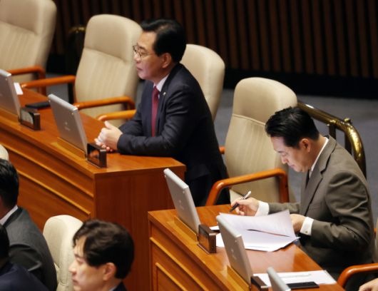 ▲국민의힘 장동혁 대표와 송언석 원내대표가 지 9일 서울 여의도 국회 본회의에서 더불어민주당 정청래 대표의 교섭단체 대표 연설을 듣고 있다. ⓒ연합뉴스 |