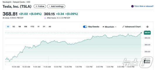 11일(현지 시각) 뉴욕증시에서 테슬라는 6.04% 급등한 368.81달러를 기록했다. 이로써 시총도 1조1900억달러로 불었다.
