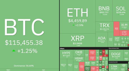 12일 오전 9시 코인360을 기준으로 시장 대장주인 비트코인은 11만5455달러를 기록하며 1.25% 상승, 견고한 상승 추세를 이어갔다. 비트코인의 시장 점유율은 56.60%로 여전히 시장의 방향을 결정하는 핵심 지표로 자리 잡고 있다.