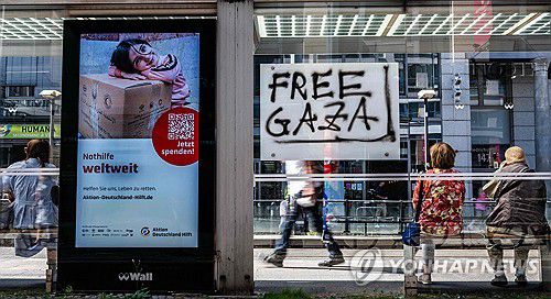 팔레스타인 국가 인정을 요구하는 독일 시위대들이 버스 정류장에 부착한 'FREE GAZA' 부착물 |