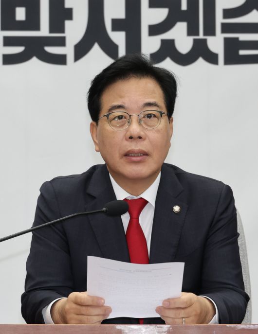 국민의힘 송언석 원내대표가 12일 서울 여의도 국회에서 열린 원내대책회의에서 발언하고 있다./연합뉴스 |