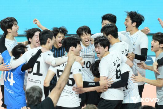 현대캐피탈 선수들이 지난해 통영에서 열린 코보(KOVO)컵대회 남자부 결승에서 우승한 뒤 기뻐하고 있다. 한국배구연맹 제공