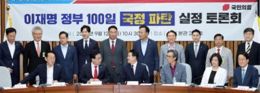장동혁 국민의힘 대표와 송언석 원내대표가 12일 국회에서 열린 이재명 정부 100일 국정 파탄 실정 토론회에서 참석자들과 기념촬영을 하고 있다. <ⓒ투자가를 위한 경제콘텐츠 플랫폼, 아시아경제(www.asiae.co.kr) 무단전재 배포금지>