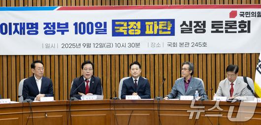 (서울=뉴스1) 이승배 기자 = 송언석 국민의힘 원내대표가 12일 서울 여의도 국회에서 열린 '이재명 정부 100일 국정 파탄 실정 토론회'에 참석해 인사말하고 있다. 2025.9.12/뉴스1photolee@news1.krCopyright ⓒ 뉴스1. All rights reserved. 무단 전재 및 재배포, AI학습 이용 금지.