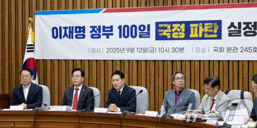 (서울=뉴스1) 이승배 기자 = 장동혁 국민의힘 대표가 12일 서울 여의도 국회에서 열린 '이재명 정부 100일 국정 파탄 실정 토론회'에 참석해 인사말하고 있다. 2025.9.12/뉴스1