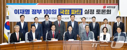 (서울=뉴스1) 이승배 기자 = 장동혁 국민의힘 대표와 송언석 원내대표가 12일 서울 여의도 국회에서 열린 '이재명 정부 100일 국정 파탄 실정 토론회'에서 주요 참석자들과 기념촬영하고 있다. 2025.9.12/뉴스1photolee@news1.krCopyright ⓒ 뉴스1. All rights reserved. 무단 전재 및 재배포, AI학습 이용 금지.
