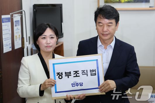 문진석 더불어민주당 원내수석과 백승아 원내대변인이 12일 오전 서울 여의도 국회 의안과에 정부조직법 개정안을 제출하고 있다. 2025.9.12/뉴스1 ⓒ News1 신웅수 기자 |