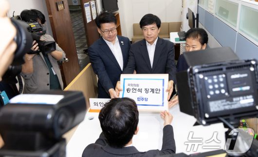 (서울=뉴스1) 이승배 기자 = 이성윤 더불어민주당 법률위원장, 임호선 수석사무부총장, 문정복 조직부총장이 12일 서울 여의도 국회 의안과에 송언석 국민의힘 원내대표 징계안을 제출하고 있다. 앞서 송 원내대표는 정청래 민주당 대표의 국회 교섭단체 연설에서 "노상원 수첩이 현실로 성공했더라면 이재명도, 정청래도 이 세상 아닐 것"이라는 대목이 나오자 "제발 그리됐으면 좋았을 것"이라고 말해 논란이 일었다. 2025.9.12/뉴스1