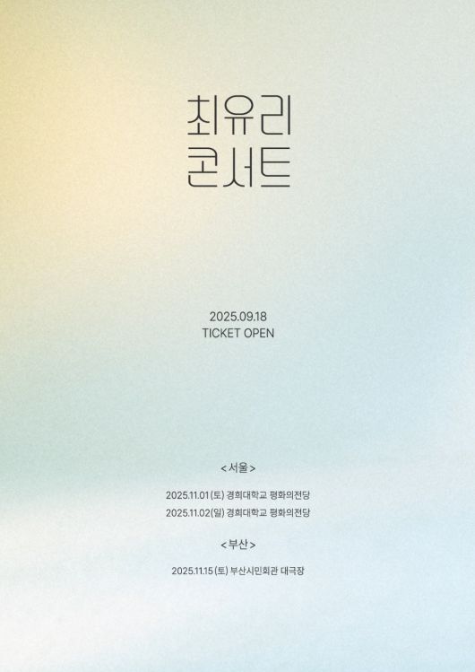 최유리는 오는 11월 1일과 2일 양일간 서울 경희대학교 평화의 전당, 11월 15일 부산시민회관 대극장에서 최유리 콘서트 2025 '머무름'을 개최한다.
