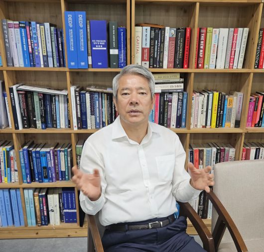 김만기 카이스트 교수가 서울시 강남 율촌 미팅룸에서 12일 헤럴드경제와 미국 국방조달 시장과 마스가 프로젝트와 관련한 이야기를 나누고 있다. [사진=전현건 기자] |