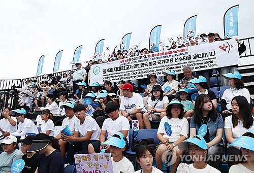 (광주=연합뉴스) 김성민 기자 = 12일 광주 동구 국립아시아문화전당 5·18민주광장에서 열린 2025 세계양궁선수권대회 리커브 여자 개인전 8강에서 시민들이 응원을 하고 있다. 2025.9.12