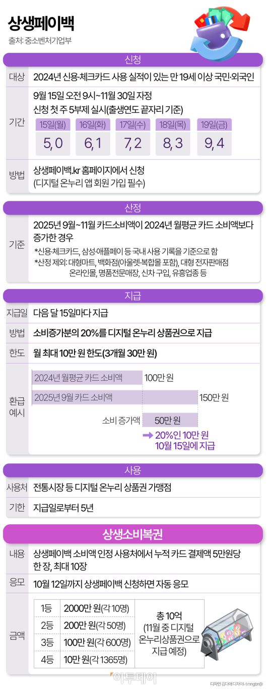 정부가 가을 소비를 살리기 위해 내놓은 ‘상생페이백’이 15일부터 신청을 받습니다. 핵심은 작년 월평균 카드사용액보다 늘어난 만큼의 20%를 돌려주는 것. 다만 어디서, 어떻게 결제하느냐에 따라 인정·불인정이 갈리는데요. 제도 개요부터 신청방법, 지급날짜, 예상금액, 불인정 사용처 등 헷갈리는 내용을 총정리했습니다.