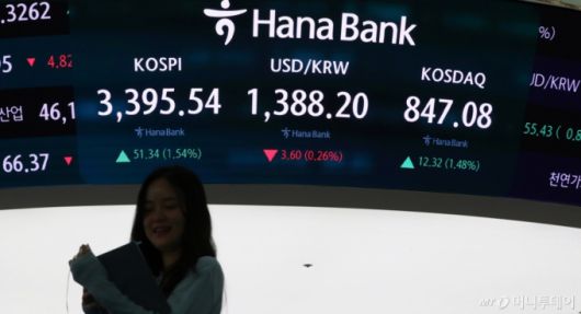 코스피가 전 거래일(3344.20)보다 51.34포인트(1.54%) 오른 3395.54에 장을 마감한 12일 오후 서울 중구 하나은행 딜링룸 전광판에 지수가 표시 되고 있다. /사진=뉴시스 |