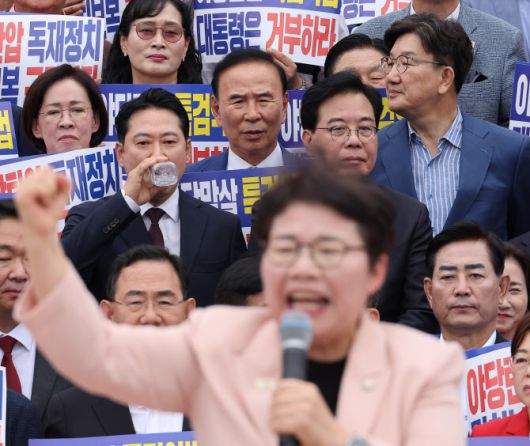 국민의힘 장동혁 대표, 송언석 원내대표, 권성동 의원이 12일 서울 여의도 국회 본청 앞 계단에서 열린 ‘야당 탄압 독재정치 규탄 대회’에서 임이자 의원의 발언을 듣고 있다. (사진=연합뉴스) |