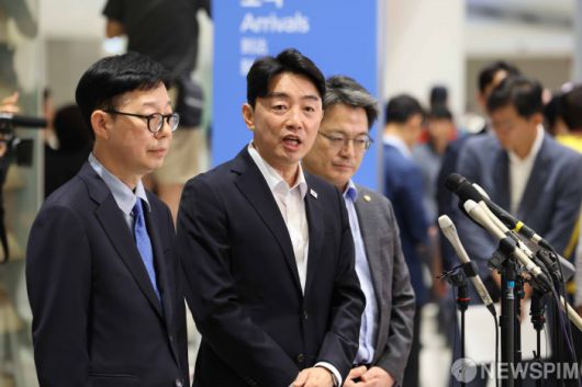 [영종도=뉴스핌] 김학선 기자 = 강훈식 대통령 비서실장(가운데)이 미국 조지아주 포크스턴 구금시설에 수감됐던 한국인 노동자들이 돌아온 12일 오후 인천국제공항 제2여객터미널에서 취재진의 질문에 답하고 있다. 맨 왼쪽은 박윤주 외교부 1차관의 모습. 2025.09.12 yooksa@newspim.com |