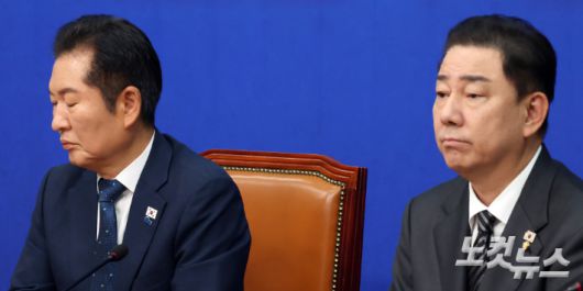 하지만 정청래 대표의 말을 듣고 있던 김병기 원내대표는 별다른 반응도, 별다른 말도 하지 않았습니다.