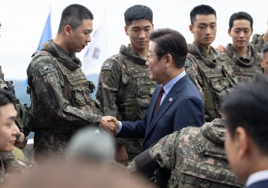 이재명 대통령(가운데)이 12일 강원 화천군 7사단을 방문해 장병들을 격려하고 있다. 강원 지역 타운홀 미팅 이후 군부대에 방문한 이 대통령은 “확고한 안보 유지 못지않게 장병들의 생명과 건강도 매우 중요하다”며 “실전처럼 훈련하되 늘 안전을 최우선으로 해야 한다”고 당부했다.