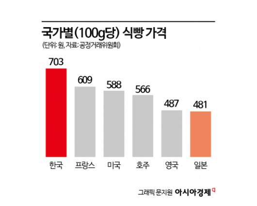 공주대 산학협력단이 공정거래위원회 의뢰로 수행한 '제빵산업 시장분석 및 주요 규제 경쟁영향평가' 보고서에 따르면 2023년 기준 한국의 빵 소비자물가지수(CPI)는 129로 일본(120)보다 높았다. 국가별 식빵 가격(100g 기준)을 비교해도 한국이 703원으로 가장 비쌌다. 이어 ▲프랑스 609원 ▲미국 588원 ▲호주 566원 ▲영국 487원 순이었으며, 일본은 481원으로 조사 대상국 중 가장 낮았다.