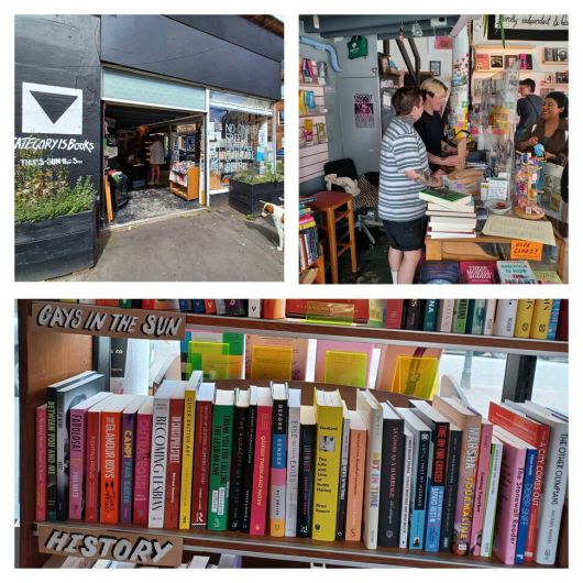 영국 스코틀랜드 글래스고에 위치한 독립서점 ‘카테고리 이즈 북스’의 안팎. 지난 8월2일 토요일 오전 손님들로 북적였다. 서점을 운영하는 핀(검은 옷)과 더피 부부(위 오른쪽), 이들이 분류해 둔 ‘햇살 속 게이’와 ‘역사’ 코너(아래)가 보인다. 임인택 기자 imit@hani.co.kr |