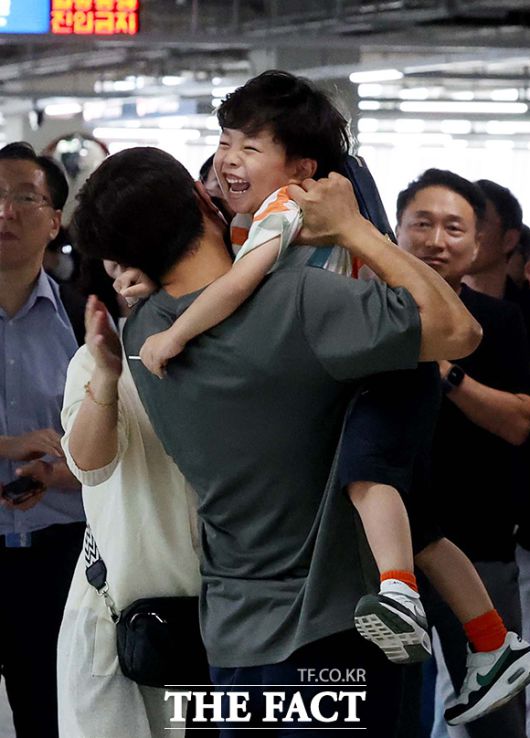 미국 조지아주 현대차그룹-LG에너지솔루션 배터리 합작 공장 건설 현장에서 구금됐다가 석방된 한국인 노동자들이 12일 오후 인천국제공항을 통해 귀국해 가족들과 인사를 나누고 있다. /인천국제공항=박헌우 기자 |