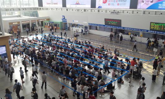 2016년8월17일, 추석 연휴 경전·경부선 현장 예매가 진행된 서울역사 내 맞이방에서 현장 예매를 기다리는 시민들이 줄지어 앉은 풍경이 눈에 띈다. 김동환 기자 |