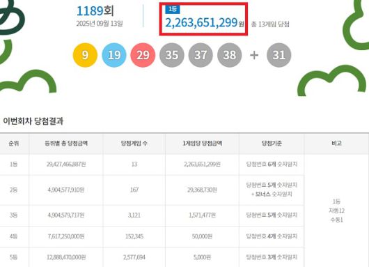 1189회 1등 당첨번호 '9, 19, 29, 35, 37, 38'···보너스 번호 '31'