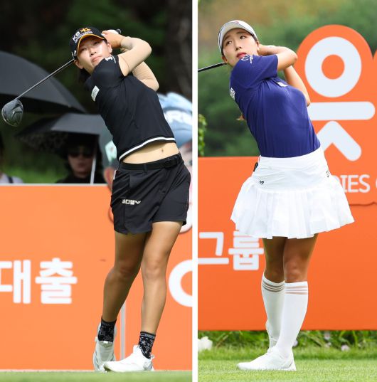 방신실(왼쪽)과 이동은이 경기도 포천의 포천아도니스 컨트리클럽에서 열리고 있는 KLPGA 투어 OK저축은행 읏맨 오픈에서 2라운드 공동 선두에 오르며 우승에 도전한다. 두 선수가 티샷을 하고 있다. KLPGA 제공 |