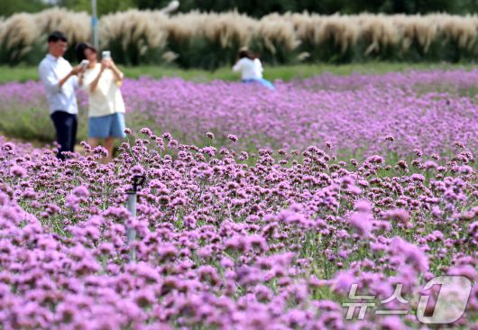 부산 강서구 대저생태공원을 찾은 시민들이 활짝 핀 버베나꽃을 감상하며 가을 분위기를 즐기고 있다. 2025.9.11/뉴스1 ⓒ News1 윤일지 기자