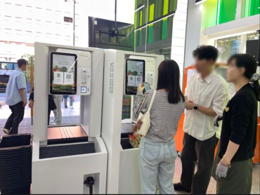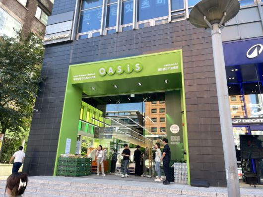 서울 강남 신논현역 7번출구 앞에는 지난 10일 오픈한 오아시스마켓 강남 신규 매장이 위치해 있습니다. 이 매장에는 다른 곳에 없는 기기가 있습니다. 매장 입구에 자리하고 있는 4대의 AI 무인계산 시스템 ‘루트100’입니다.