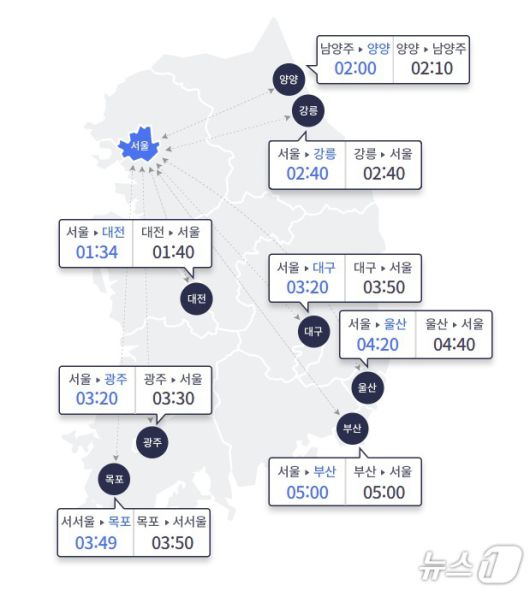 같은 시간 서울에서 지방 주요 도시까지는 △부산 5시간 △울산 4시간 20분 △강릉 2시간 40분 △양양 2시간(남양주 출발) △대전 1시간 34분 △광주 3시간 20분 △목포 3시간 49분(서서울 출발) △대구 3시간 20분이다.