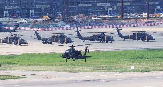 유사시 한반도 방어를 위한 정례 한미연합훈련 ‘을지 자유의 방패’(UFS·Ulchi Freedom Shield) 연습이 지난달 18일 시작됐을 때 경기도 평택시 캠프 험프리스에서 아파치 헬기가 이동하고 있다. [연합] |