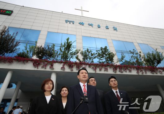 장동혁 국민의힘 대표가 14일 경찰에 최근 구속된 손현보 목사가 담임 목사로 있는 부산 강서구 세계로교회 예배에 참석하며 취재진 질문에 답하고 있다. 2025.9.14/뉴스1 ⓒ News1 윤일지 기자 |