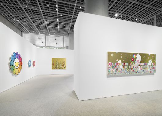 국제적인 갤러리 가고시안이 지난 2일부터 서울 용산구 아모레퍼시픽 본사 1층 APMA캐비닛에서 열고 있는 개인전 ‘서울, 귀여운 여름방학’은 무라카미 특유의 꽃을 가득 채운 자리다. 너비가 3m에 이르는, 금박이 씌워진 캔버스에는 특유의 웃는 꽃이 주인공처럼 가득 들어차 있고, 폭 2m 가까운 또 다른 금박의 캔버스에는 일본 특유의 꽃 그림 속에 미소가 빼꼼 숨어있다. 가고시안은 미술품 장터(아트페어) 프리즈 서울에서도 너비 6m에 이르는 무라카미의 2014년 작 금박 병풍을 대표작으로 걸었다. 형형색색의 꽃잎과 직관적으로 이해할 수 있는 밝은 표정은 많은 사람들이 찾는다.