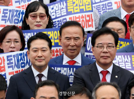 장동혁 대표와 송언석 원내대표를 비롯한 국민의힘 의원들이 지난 12일 국회 본청 앞 계단에서 열린 ‘야당탄압 독재정치 규탄대회’에서 규탄사를 듣고 있다. 박민규 선임기자 |