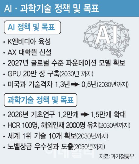인재 육성 드라이브도 본격화한다. “2030년까지 AI 코어 인재 3000명, AX 융합 인재 5000명, 총 8000명을 양성하겠다. 또 상위 1% 연구자(HCR) 100명, 해외 인재 2000명을 유치해 첨단바이오 등에서 세계 1위 기술 10개를 확보하고, 노벨상급 성과를 내겠다”는 구상이다.