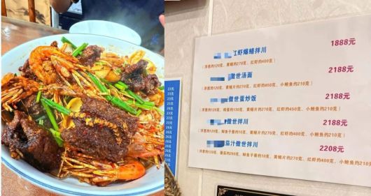 메뉴에 따르면 2188위안짜리 요리에는 양파 120g, 계란 130g, 캐비어 10g, 장어 270g, 새우 400g, 전복 210g이 들어 있다.