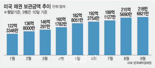 증가 속도도 가팔라지고 있다. 지난 6월 말 192억 3754만달러였던 미국 채권 보관금액은 7월 말 199억 1126만달러로 한 달 새 6억 7372만달러가 증가했다. 8월 말에는 이 금액이 215억 5690만달러로 한 달 만에 16억 4563달러가 불어났다. 이달 들어서도 2억 4742만달러가 늘어나며 연일 최대치를 갈아치우고 있다.
