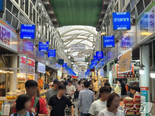 일요일인 14일 강원 강릉 대표 전통시장인 중앙·성남시장 먹거리골목이 나들이객들로 가득하다.2025.9.14/뉴스1 윤왕근 기자 |