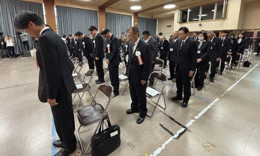 일본 니가타현 사도섬 아이카와개발종합센터에서 13일 열린 '사도광산 추도식'에서 참가자들이 묵념하고 있다. 한국은 작년에 이어 올해도 추도식에 불참해 2년 연속 '반쪽' 행사로 치러졌다. 연합뉴스 |
