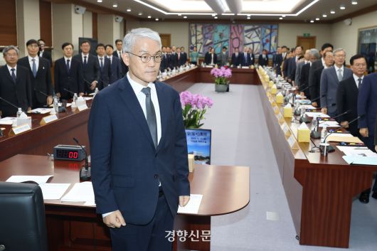 천대엽 법원행처장과 전국 각급 법원장들이 12일 서울 서초구 대법원에서 열린 전국법원장회의 임시회의에 참석하고 있다. 한수빈 기자