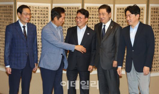 [이데일리 노진환 기자] 정청래 더불어민주당 대표가 14일 오후 서울 종로구 삼청동 총리 공관에서 열린 당정대 고위급 만찬회동에서 기념촬영을 마친뒤 악수하기 위해 김병기 원내대표에게 손을 내밀고 있다. 왼쪽부터 우상호 정무수석, 정 대표, 김민석 국무총리, 김 원내대표, 강훈식 대통령 비서실장.