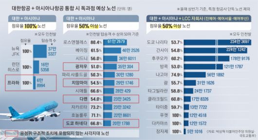 대한항공·아시아나 통합 시 독과점 예상 노선