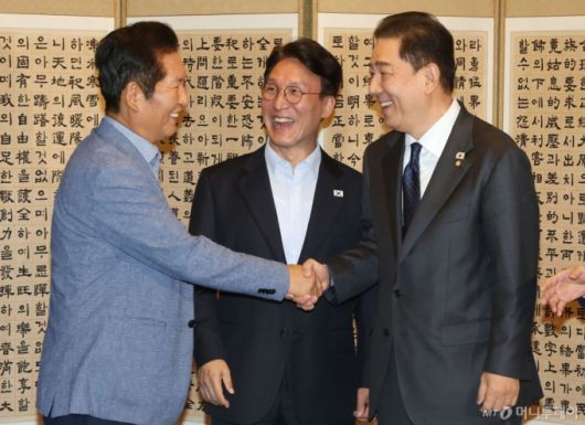 (서울=뉴스1) 이광호 기자 = 정청래 더불어민주당 대표와 김병기 원내대표가 14일 오후 서울 종로구 삼청동 총리 공관에서 열린 당정대 고위급 만찬회동에서 악수하고 있다. 가운데는 김민석 국무총리. 2025.9.14/뉴스1 Copyright (C) 뉴스1. All rights reserved. 무단 전재 및 재배포, AI학습 이용 금지. /사진=(서울=뉴스1) 이광호 기자 |
