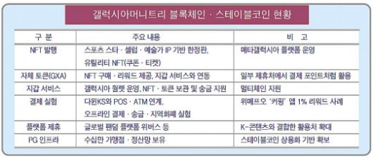 갤럭시아머니트리는 국내 주요 PG사 가운데 가장 적극적으로 블록체인·가상자산 실험을 이어온 곳으로 꼽힌다. 자회사 갤럭시아메타버스를 통해 NFT 발행·거래 플랫폼 '메타갤럭시아'를 운영하고 있다.