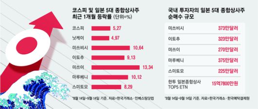 일본 5대 종합상사 가운데 미쓰이물산도 한 달간 주가가 13.34% 치솟았고, 이토추상사(9.13%)·스미토모상사(8.29%)·마루베니(10.12%) 등도 닛케이 지수를 상회하는 성적을 냈다. 이때 국내 증시에서는 일본 종합상사 5곳에 동시에 투자하는 한투 일본종합상사TOP5 상장지수증권(ETN)이 8.4% 상승했다.국내 일학 개미도 순매수 행진