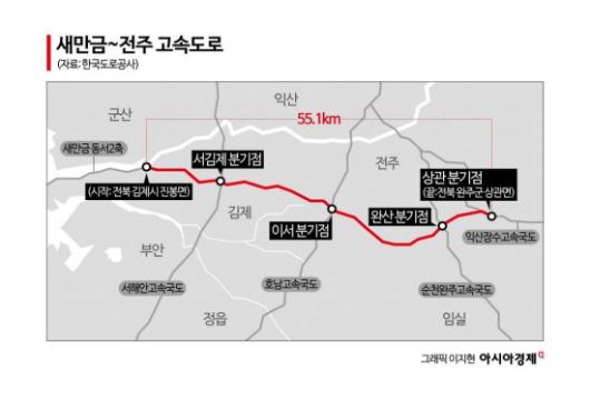 새만금~전주 고속도로는 국가 간선 도로망 가운데 동서 3축을 이루는 핵심 노선이다. 새만금에서 포항까지 이어지는 총 298㎞ 구간 중 새만금~전주 구간은 전북 김제시 진봉면(새만금 방조제)에서 완주군 상관면 구간에 건설된다. 상관터널(3.8㎞)과 완산터널(3.6㎞) 등 장대 터널을 포함해 터널 7개소, 교량 105개소가 포함됐다.