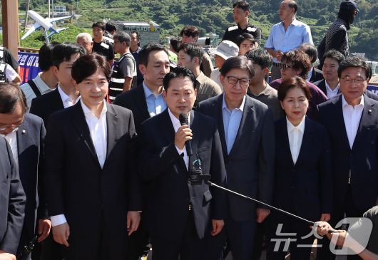 장동혁 국민의힘 대표가 14일 부산 강서구 가덕도 대항전망대를 찾아 가덕도신공항 건설 예정지를 살펴본 뒤 발언을 하고 있다. 2025.9.14/뉴스1 ⓒ News1 윤일지 기자 |