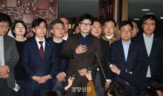 지난해 12월4일 한동훈 당시 국민의힘 대표가 국회 본회의장 앞에서 윤석열 전 대통령의 비상계엄 선포와 관련해 기자회견을 하고 있다. 박민규 선임기자 |